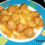 Elaboración del guiso: En un vaso o contenedor amplio pondremos la cebolla, el tomate pelado, los pimientos y la zanahoria, todo cortado pequeño, las almendras tostadas y peladas y el vaso de vino blanco, lo trituraremos con un turmix bien hasta que quede todo como una crema. Reservar.En una cazuela de barro o convencional pondremos una buena base de aceite de oliva virgen, lo calentaremos y pasaremos las albondigas, sólo para dorar la parte exterior y las reservaremos.En éste mismo aceite pondremos el triturado que hemos reservado y a fuego medio lo sofreiremos. Sabremos que tenemos a punto el sofrito cuando veamos que tiene un color oscuro y suelta aceite. Nos ha de recordar la textura de una mermelada. Hay que ir removiendo a menudo para que no se nos pegue. Seguido incorporamos la sepia cortada a trozos, removemos, lo dejamos 5 minutos a fuego fuerte y removiendo a menudo.Añadimos las albondigas y agua hasta casi cubrirlas. Dejaremos que coja temperatura y cuando empiece a hervir contaremos unos 30 minutos dejándolo a fuego medio y taparemos. De vez en cuando vigilaremos y removeremos. Comprobaremos que la sepia está tierna, si no es así, lo dejaremos guisándose hasta que consigamos la textura adecuada recitificando de caldo o agua si fuera necesario. Si al finalizar el tiempo vemos que la salsa está demasiado líquida podemos coger un poco de salsa en un vasito, añadir una cucharada de Maicena, disolverlo bien y añadirlo a la cazuela. En caso que veámos que se nos espesa antes de terminar los 30 minutos, o de que la sepia esté tierna, añadir un poco de agua durante la cocción.