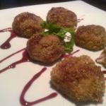 Buñuelos de bacalao con corazon tierno de queso y slasa de vino tinto