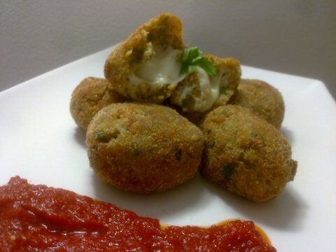 Condimentar la pulpa con queso parmesano rallado, perejil picado, pimienta huevo y el ajo picado. Mezclar bien y anadir la cantidad necesaria de miga de pan, hata obtenir una mezcla mas dura. Cortar la mozzarella en trocitos y formar bolitas en la que poner un corazon de mozzarella. Pasarlas en panrallado y poner en frigorifiro para media hora.