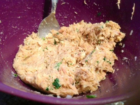 En un bol echamos el bonito (o atún) escurrido añadir ajo, cebolla y puerro picado el pan rallado y perejil.Mezclar todo con un tenedor.