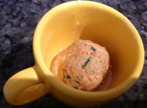 Coger la masa ayudándonos con una cuchara y hacer bolitas del tamaño de una nuez.Para formar las bolas yo me ayudo con una tacita y un poquito de harina.