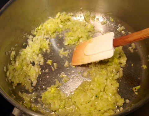 Añadir a la sartén  puerro y cebolla picaditos en el aceite a fuego lento luego el ajo, pimiento y tomate y un tapón de Pedro Ximenez Una vez hecho triturar. Mientras se pochan las verduras preparamos las albóndigas.