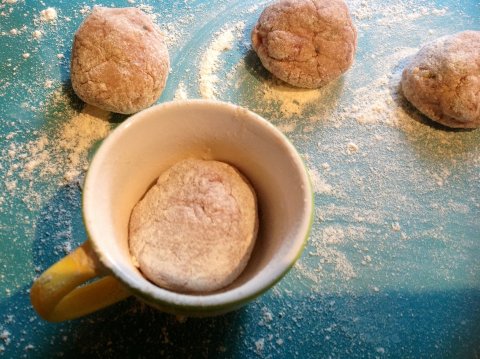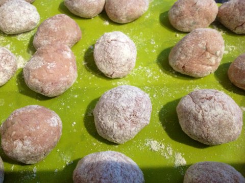 Mezclar bien con las manos.Hacer bolas y pasarlas por harina.