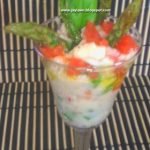 Emplatar en una copa el granizado, rallado con un tenedor, junto con las albondigas en un palito o por los alrededores.