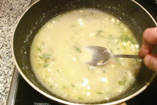 Añadir como una media cuchara de harina y albahaca picada en el agua del marisco.