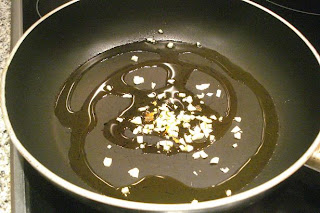 En una sartén, poner 4 cucharadas de aceite, el ajo picado y una guindilla.