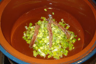 En una cazuela de barro, poner 3 ó 4 cucharadas de aceite, el medio puerro picado y los filetes de anchoas.