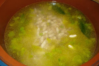 Incorporar las alubias, rehogar. Añadir las hojas de laurel y cubrir con agua o caldo.