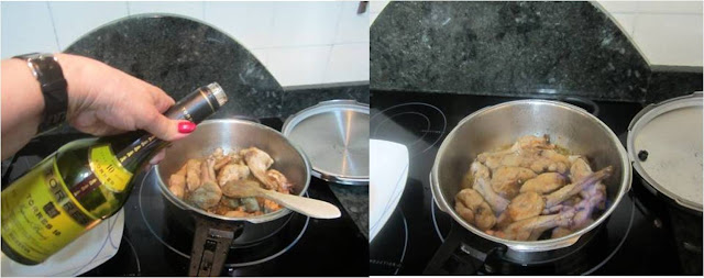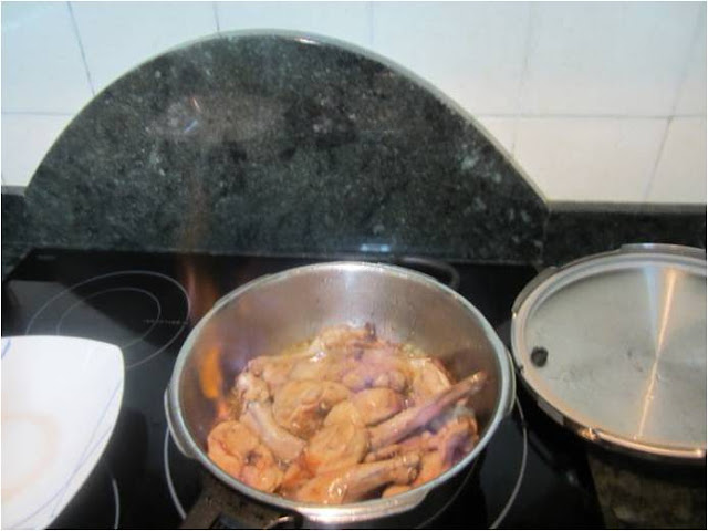 Echamos el aceite en la olla y freímos el conejo a fuego vivo unos minutos hasta que este dorado por fuera, le echamos el coñac y prendemos fuego.