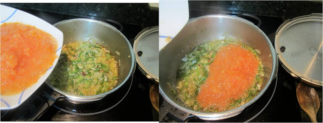Añadimos el tomate rallado a las verduras y dejamos que se fría todo junto unos 5 minutos.