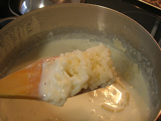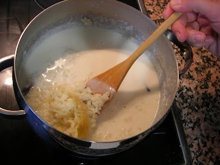 3. Tras añadir todo el arroz reducir el fuego al mínimo y dejar que cueza unos 40 minutos aproximadamente (dependerá del arroz que utilicéis y de vuestra cocina) y podéis ir añadiendo leche poco a poco a vuestro gusto según os guste más o menos espeso.