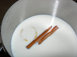 1. Poner a hervir un litro de leche junto con la sacarina (el medio de leche restante lo añadiremos según vaya cociendo), la vaina de vainilla y la corteza de limón a fuego medio hasta que comience a hervir ligeramente.