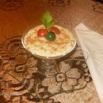 Fritos crujientes de arroz con leche sobre crema espumosa de canela