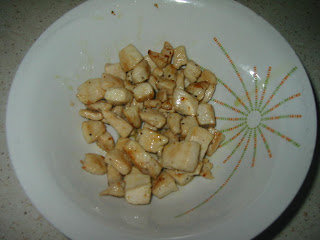 Corta la pechuga de pollo a cuadraditos, salpimentala y friela en una sarten con aceite.