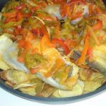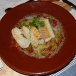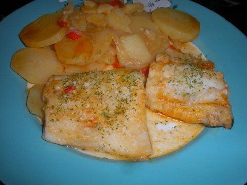 Cuando se este acercando la patata a su punto le añadimos los lomos de Bacalao y lo tendremos 5 minutos aproximadamente para que se cocine el pescado.