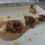 Tortelloni de chocolate rellenos de bacalao con salsa de castanas.