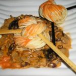 Zarajos italianos en salsa de setas con toques orientales..(espaguetis )