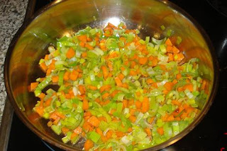 En una sartén, poner 3 cucharadas de aceite, el puerro y la zanahoria picados.