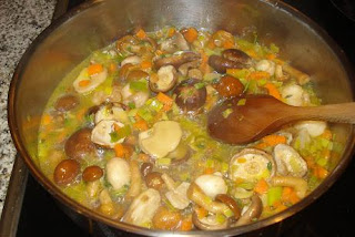1 lata de berberechos al natural, 200 gr. de setas mixtas, 1/2 puerro, 1 zanahoria, tomillo, albahaca, romero, perejil, aceite, sal, vino blanco.