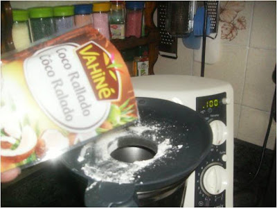 Añadimos las harinas con el coco y 6 segundos V. 3, y si no esta bien mezcladas la harinas nos ayudamos con la espátula