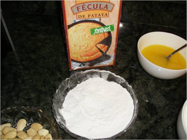 Una vez hecha harina  las almendras añadimos el harina de trigo y la fécula, yo le puse fécula de patata pero se puede poner de maíz (Maicena) y las trituramos juntas.