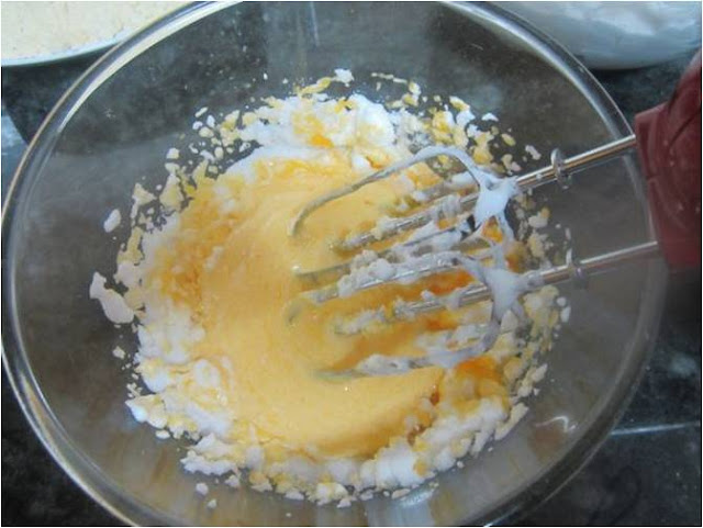 Separamos las yemas de las claras y batimos las yemas con el azúcar glass, la vamos añadiendo cucharada de una en una hasta que triplique su volumen y haga montañitas al subir el batidor.