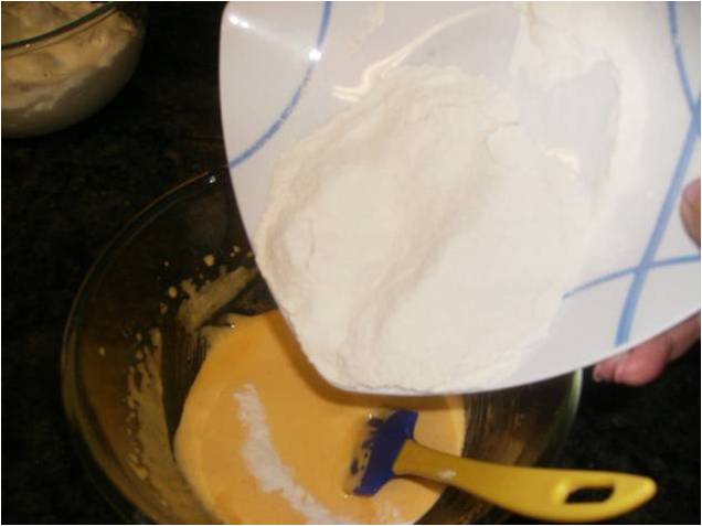 Añadimos el harina y la fécula tamizadas y mezclamos bien que no queden grumos.