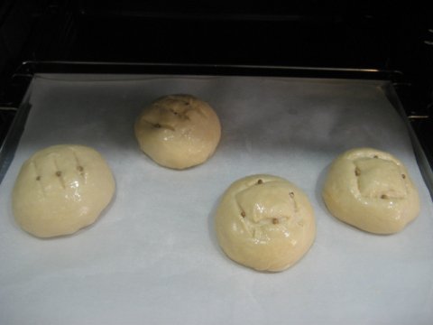 4º.- Greñar: hacer uno o varios cortes en la superficie de los bollitos. Pincelar la superficie con huevo batido y adornar con varias semillas de cilantro, tres o cuatro.