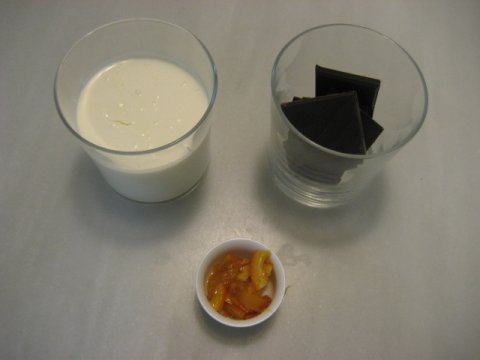Calentar la nata y el chocolate en trozos con las microondas, y derretir removiendo cada 30 segundos hasta su mezcla completa. Añadir la mermelada de naranja. Atemperar y enfriar.