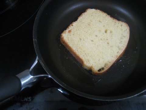 Cortar el pan en rebanadas, pincelar con aceite de oliva una de sus caras y tostar en la sartén. Si te gusta, en este momento, puedes raspar un diente de ajo sobre la superficie tostada.