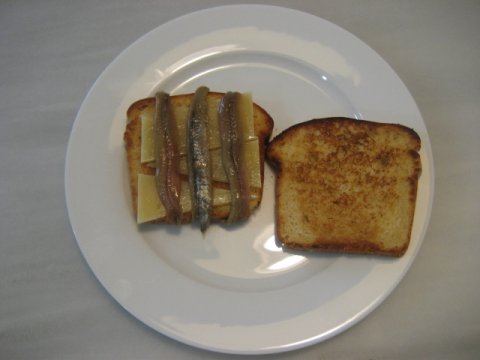 Entre las rebanadas tostadas poner queso, anchoas y lechuga según arte. (Si se pone la cara tostada en el interior los dedos no tendrán contacto con ella.)