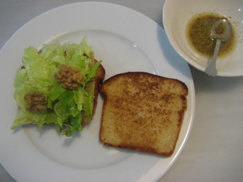 Enfrento a este emparedado una ensalada muy conocida, cosmopolita, y con apellido de autor: la ensalada cesar, de la que hay muchas variantes, aunque mis preferencias se inclinan por la misma pareja perfecta: queso y anchoa. Y lo hago porque en esta ensalada, dato curioso, nunca faltan los picatostes, es decir, pan, igual que en un bocadillo. El bocadillo se come con los dedos y la ensalada con tenedor.