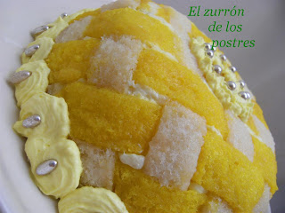 Trascurrido ese tiempo lo desmoldamos, dándole la vuelta con mucho cuidado y lo decoramos con la nata montada a la que le ponemos un poco de colorante alimentario por todo el contorno y perlas.