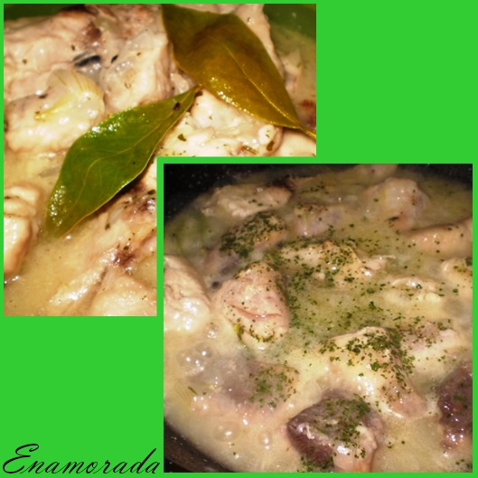 Pochar la cebolla, añadir las hojas de laurel una cucharadita de harina y rehogar, añadir el bonito que está a la espera, envolver con la cebolla y añadir al vino blanco dejar dar un hervor y espolvorear con el perejil y a la mesa- ( también se puede comer del tiempo).