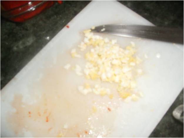 Pelamos tomate, le quitamos las semillas, cortamos en tirita muy finas, estas a su vez en cuadraditos