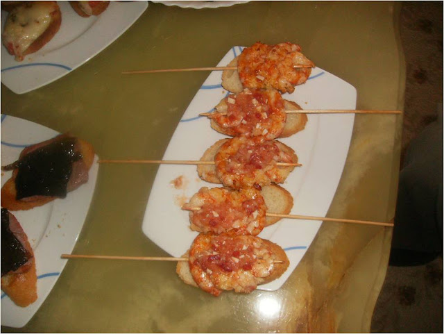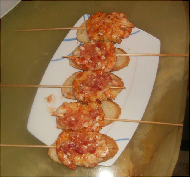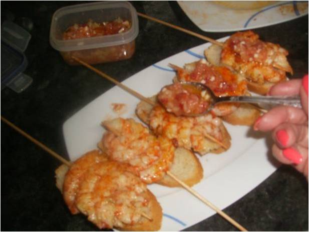 Cortamos unas rebanadas de pan finas y sobre ellas ponemos las brochetas y sobre estas un poco de la vinagreta.