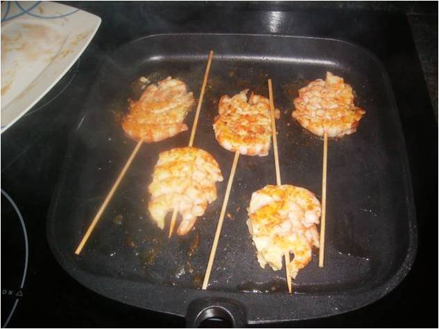 Ponemos una cucharada de aceite en la plancha y hacemos las brochetas, con la plancha caliente en 1 minuto y 1/2 están, ponemos un poco de sal en escamas sobre los gambones