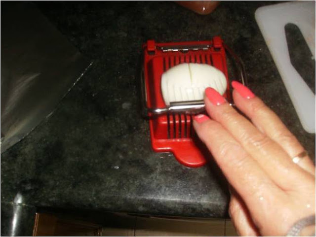 Cortamos huevo duro en laminas finas y a su vez en cuadraditos