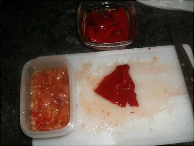 Cortamos pimientos del piquillo igual que el tomate en bastoncitos fino y después en cuadraditos, lo vamos dejando en un recipiente todo lo que vamos cortando