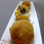 Buñuelos de bacalao con corazon tierno de queso y slasa de vino tinto