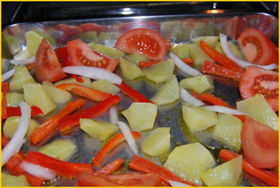 Ya en la cocina, pelamos y cortamos a trozos medianos las patatas y las ponemos en una bandeja de horno. Ponemos también unas tiras de pimiento rojo (al gusto) y unas cuñas de tomate.