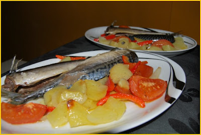 Pasados 30 minutos, retiramos y colocamos encima de este asado de patatas y verduras, las caballas limpias. Salamos y ponemos aceite de oliva y pimienta sobre las caballas y volvemos a meter al horno unos 20-25 minutos (se hace así, porque las patatas necesitan alrededor de una hora al horno, pero las caballas tan sólo unos 20 minutos)