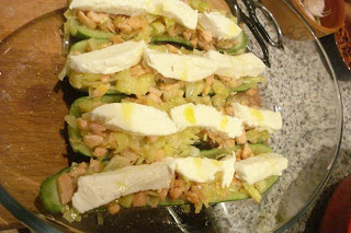 Con el compuesto, rellenar los calabacines, disponer los tacos de mozzarella y añadir un poco de aceite.