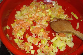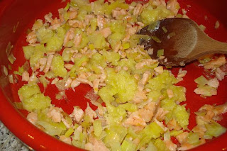 Picar la pulpa e incorporar al puerro y salmón.