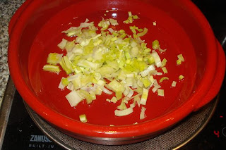 En una cazuela de barro o sartén, poner 3 cucharadas de aceite y el puerro picado.