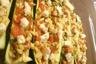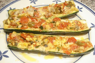 Rellenar los calabacines y distribuir taquitos de queso gorgonzola por encima.