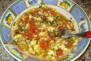 Picar la pulpa de los calabacines, la menta, el perejil, el diente de ajo, el tomate troceado, las aceitunas verdes y unas alcaparras. Incorporar en la salsita, salpimentar y remover.