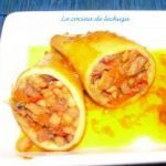 Cojemos los tubos de calamar y rellenamos con la mezcla obtenida anteriormente ( se aconseja no llenar mucho, ni tampoco al borde por que reventarían y no se cerrarían bien )