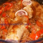 Una vez sofrita la verdura echamos los calamares rellenos , le añadimos el vaso de vino blanco y 2 de agua .