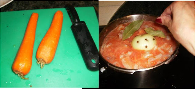 Ponemos el tomate en la olla, la cebolla con los clavos pinchados en ella y los dientes de ajos.